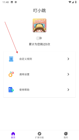 1、打開叮小跳APP,點(diǎn)擊自定義規(guī)則選項(xiàng),進(jìn)入我的規(guī)則頁(yè)面。