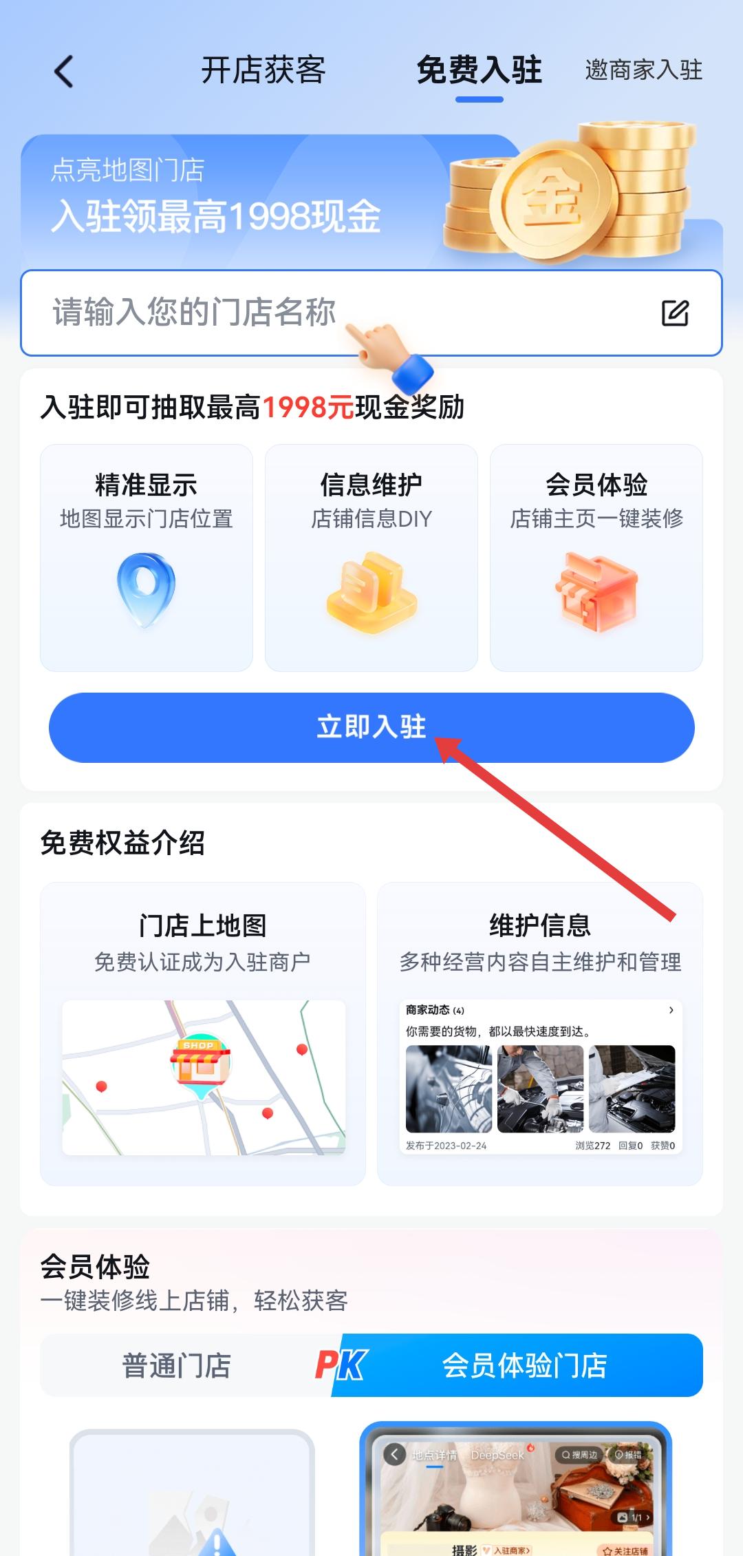 2、在開(kāi)店獲客免費(fèi)入駐的頁(yè)面,需要點(diǎn)擊藍(lán)色立即入駐的按鈕,進(jìn)入商戶入駐信息的填寫(xiě)環(huán)節(jié)。