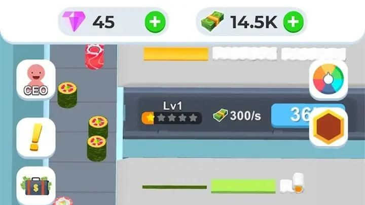 2、豐富的娛樂玩法,升級機器,不斷制作壽司,完成訂單,擴建工廠,玩法非常有趣;