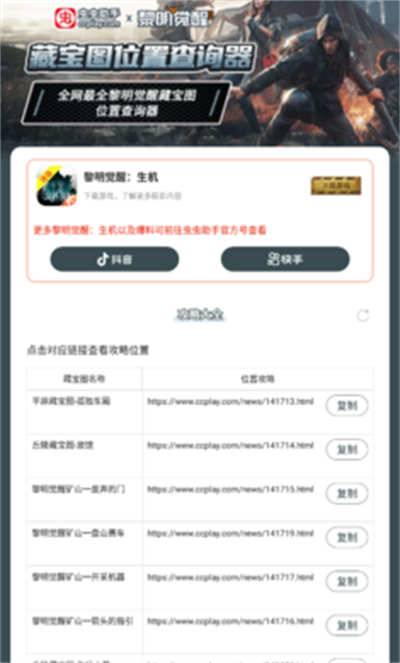 黎明覺醒藏寶圖查詢app是一款休閑的游戲,玩家可以使用這款工具來查詢不同的位置的,非常的簡單有趣,玩家不需要花費大量的時間來尋找,里面的功能是非常的豐富的,玩家可以進來體驗其中。