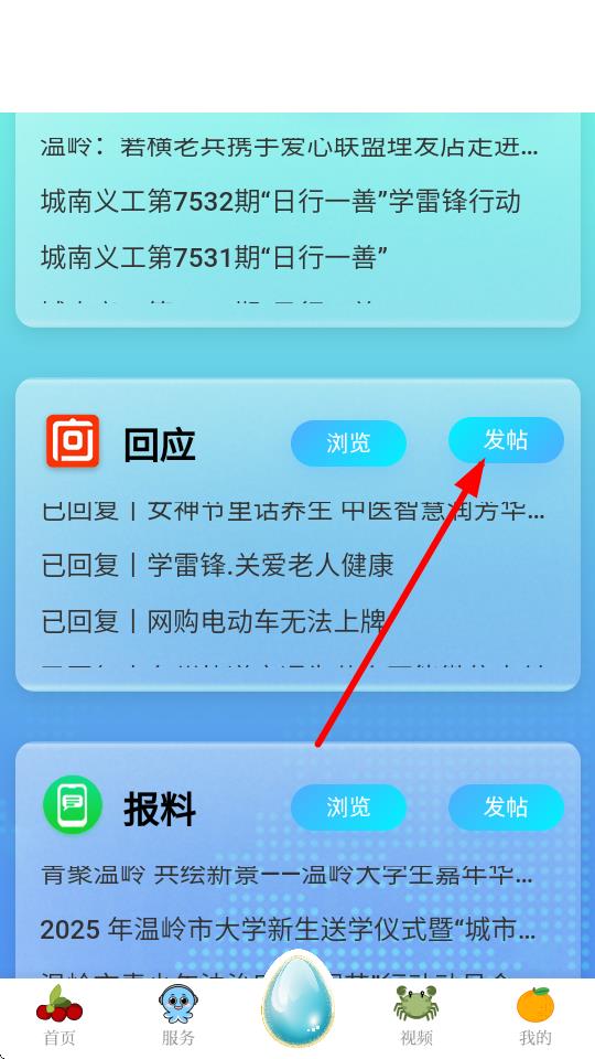 2、在服務(wù)頁(yè)面里,找到回應(yīng)板塊,點(diǎn)擊右側(cè)的發(fā)帖按鈕。
