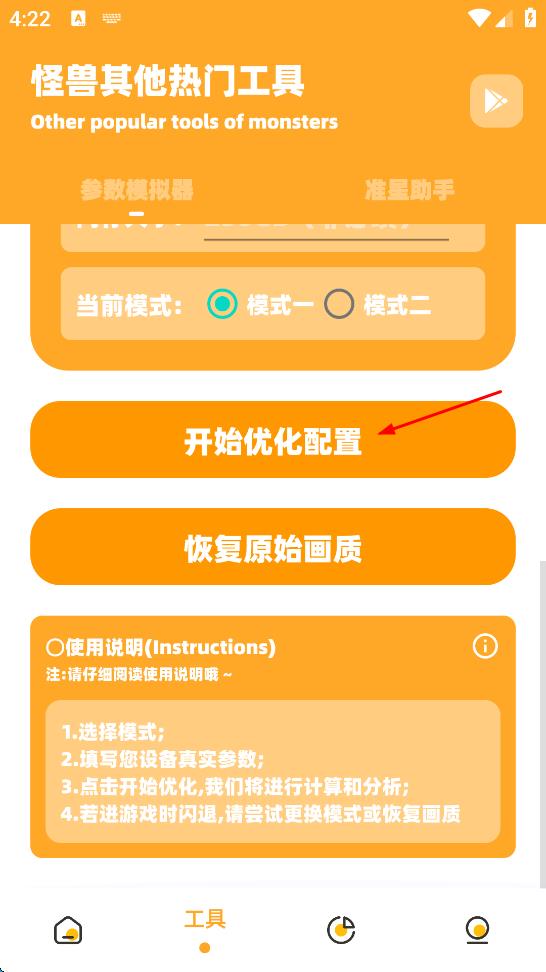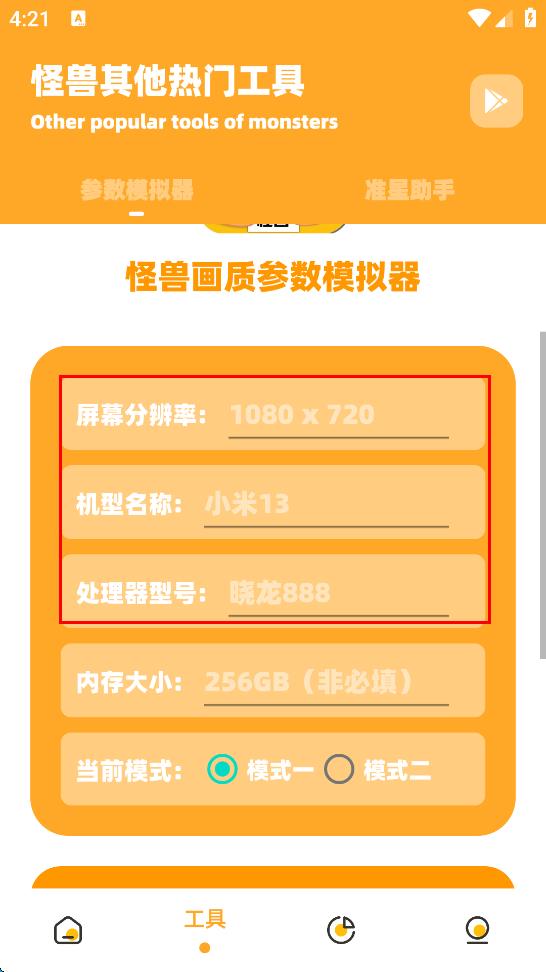 2、在工具頁面的怪獸畫質(zhì)參數(shù)模擬器中,依次填寫屏幕分辨率、機(jī)型名稱、處理器型號等設(shè)備參數(shù)。