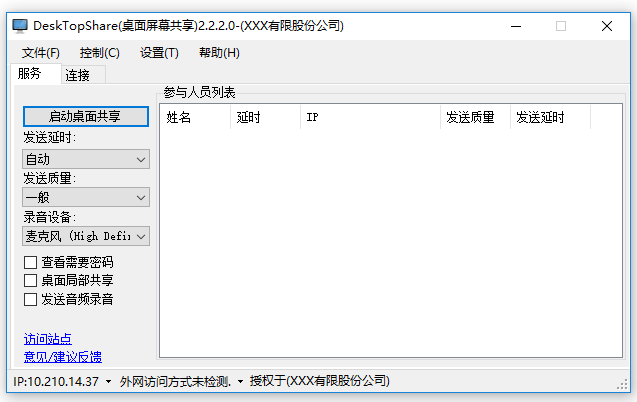 桌面屏幕共享(DeskTopShare)是一款支持多人遠程同步進行的桌面共享軟件,可以在網(wǎng)上作為投影儀來使用,實現(xiàn)多人演示,可以在局域網(wǎng)里遠程顯示對方計算機的桌面,同時也支持遠程控制,在軟件上可以看到連接用戶的狀態(tài)。