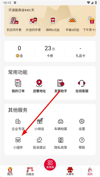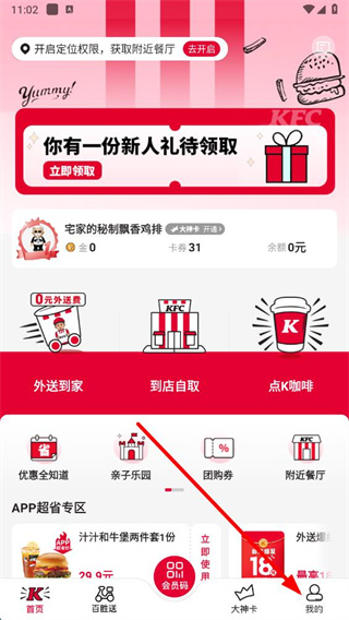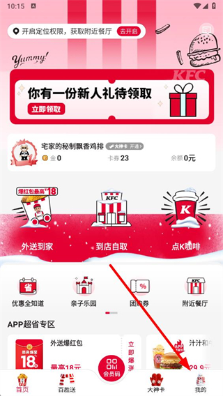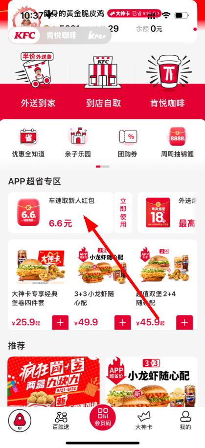 1、打開肯德基應用在首頁APP超省專區(qū)找到車速取新人紅包6.6元活動入口并點擊。