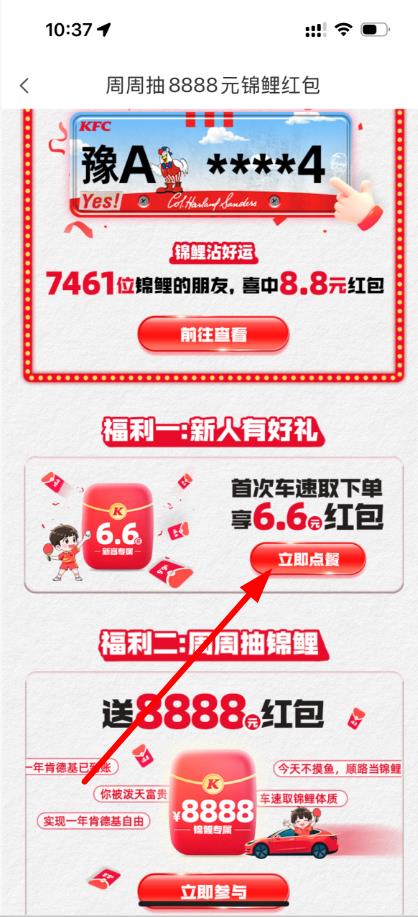 2、進入周周抽8888元錦鯉紅包活動頁面,找到福利一:新人有好禮板塊,點擊立即點餐按鈕。