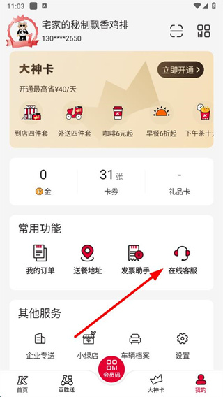 1、打開肯德基APP后,在底部導航欄點擊我的進入個人界面。