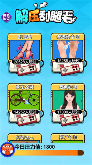 解壓刮腿毛是一款非常輕松的游戲,在這里玩家將在游戲中控制刮毛機(jī)將腿毛全部刮干凈,能給玩家?guī)碜钍孢m最減壓的體驗(yàn),不會有任何延誤,拔毛確實(shí)是一項(xiàng)技術(shù)活,需要演奏者掌握的力度非常好才能夠完成,快來開啟一場刮腿毛之旅吧!