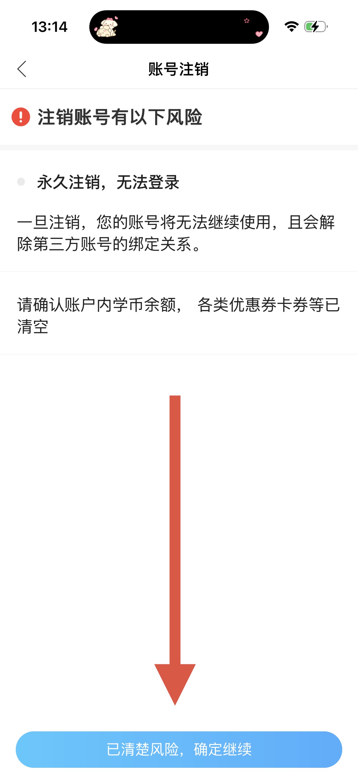 4、在賬號注銷頁面,閱讀注銷風險提示后,點擊已清楚風險,確定繼續(xù)按鈕,按照后續(xù)提示完成賬號注銷操作。