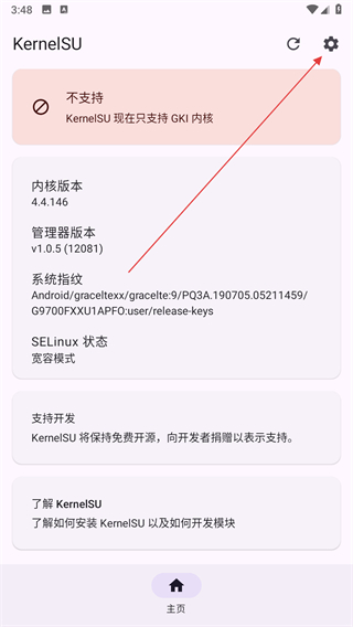 1、打開KernelSU應(yīng)用,點(diǎn)擊右上角的設(shè)置圖標(biāo)。