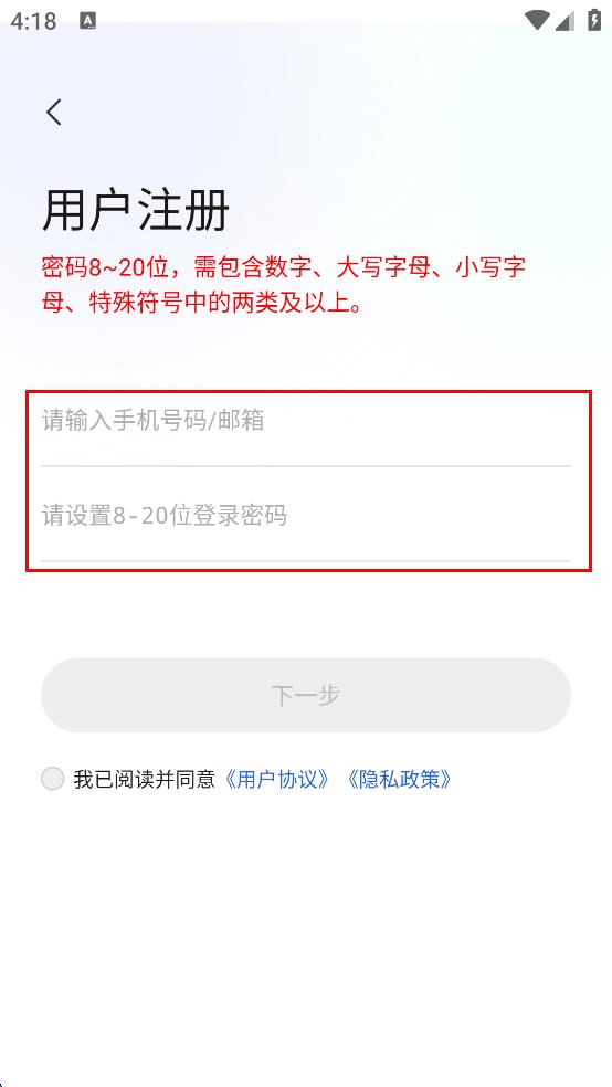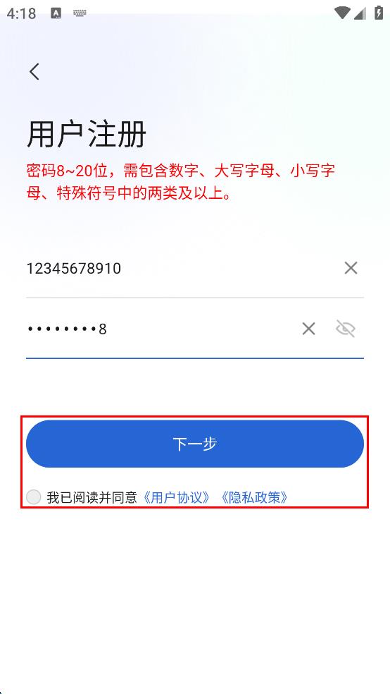 3、在用戶注冊頁面,輸入手機號碼或郵箱,然后設置8 - 20位且包含數字、大寫字母、小寫字母、特殊符號中兩類及以上的登錄密碼。