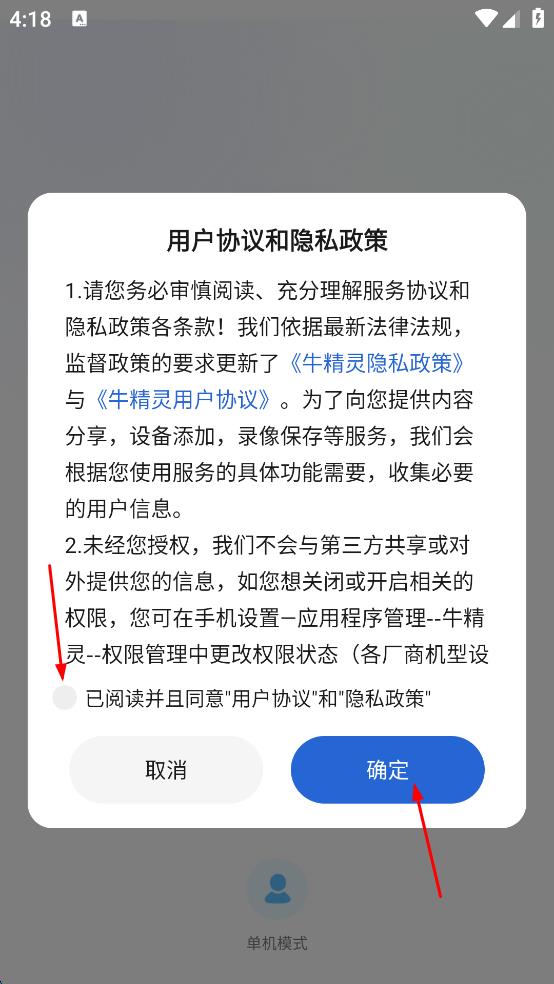 1、打開牛精靈APP,進入用戶協議和隱私政策頁面,仔細閱讀相關內容后,勾選“已閱讀并且同意用戶協議和隱私政策”,點擊“確定”按鈕,進入登錄頁面。