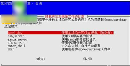 掛載再生龍鏡像文件的目錄,選擇模式"local_dev使用本機(jī)的分區(qū)(如:硬盤,隨身盤)"。注意:如果要將備份的鏡像存儲到再生龍工具U盤或是準(zhǔn)備恢復(fù)的鏡像存儲在再生龍工具U盤中,請選擇"Skip 使用現(xiàn)有的/home/partimage(可寫裝置如硬盤/隨身盤)"。