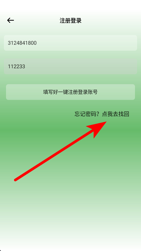 3、在注冊登錄頁面,點擊忘記密碼,點我去找回選項,進(jìn)入找回密碼界面。