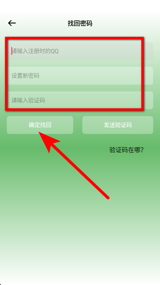 4、在找回密碼界面,依次輸入信息,點擊確定找回,即可完成密碼找回操作。