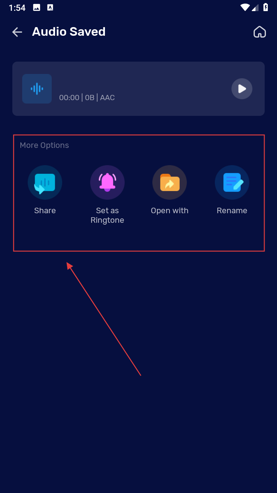 4、錄音完成后,會(huì)進(jìn)入音頻保存或處理頁(yè)面,可根據(jù)需求對(duì)錄制好的音頻進(jìn)行分享、設(shè)為鈴聲、重命名等操作。