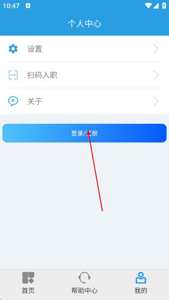 3、在個人中心頁面,點擊“登錄/注冊”按鈕,進入登錄注冊頁面。
