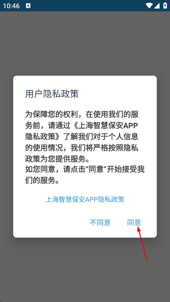 1、打開上海智慧保安APP,在彈出的用戶隱私政策提示框中,點擊“同意”按鈕。