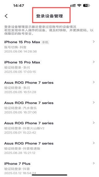 4、進(jìn)入登錄設(shè)備管理界面后,即可查看抖音賬號所有曾登錄過的設(shè)備列表。