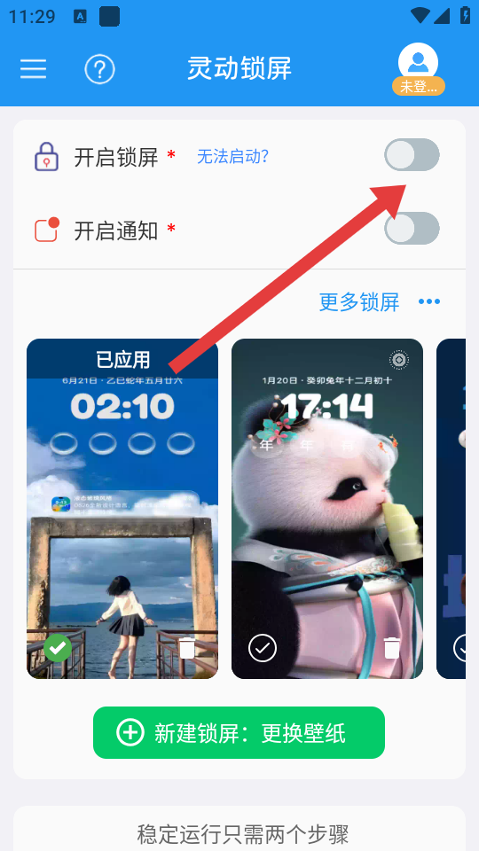1、打開靈動鎖屏APP,在主界面點擊開啟鎖屏右側(cè)的開關(guān),啟用鎖屏的功能。