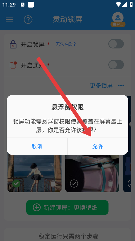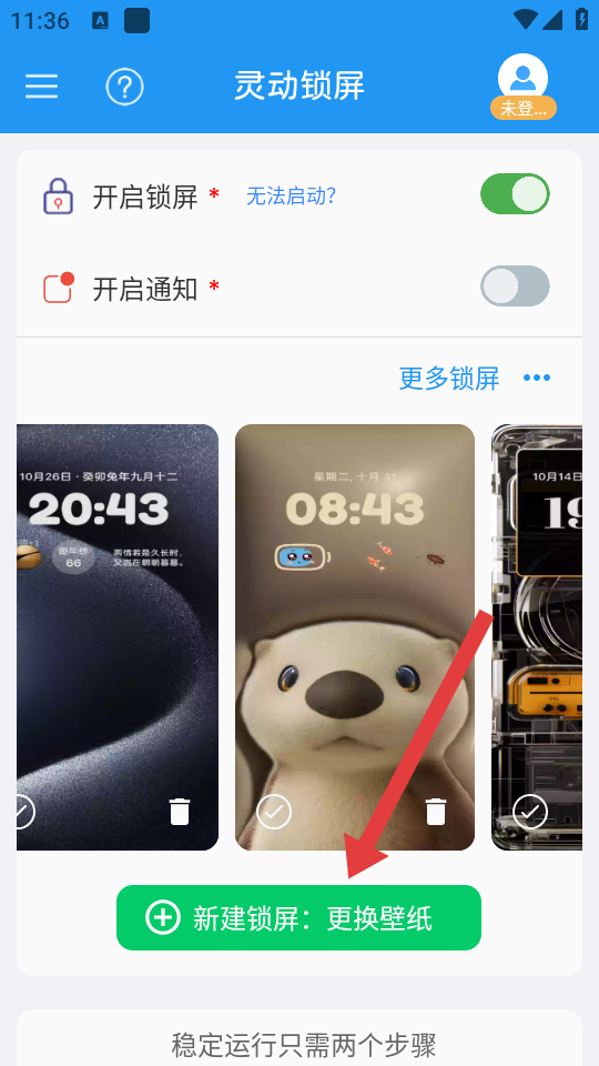 3、權(quán)限授予后,回到靈動鎖屏主界面,點擊底部新建鎖屏更換壁紙。
