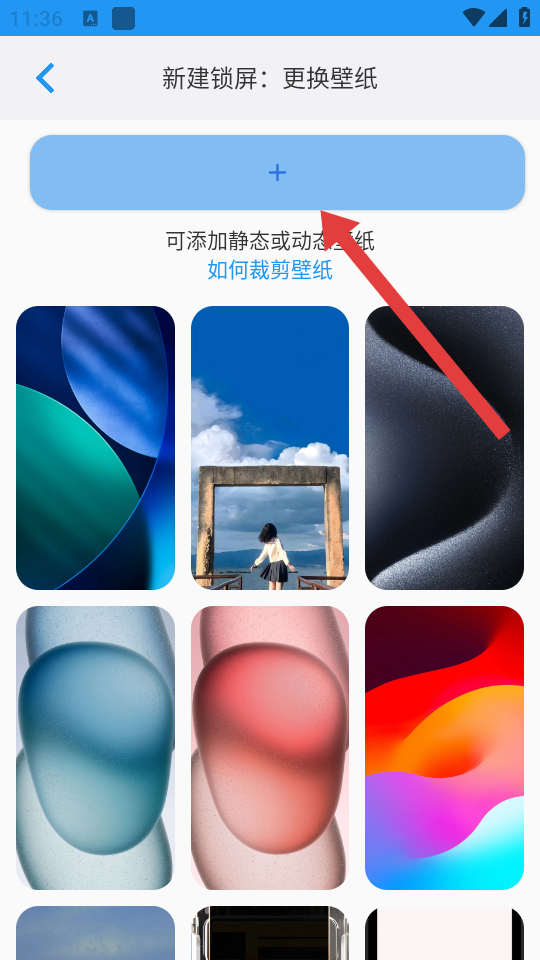 4、進(jìn)入新建鎖屏更換壁紙的頁面后,點擊頂部按鈕,添加壁紙完成鎖屏設(shè)置。