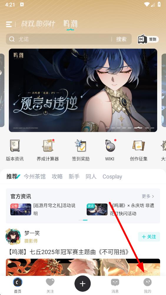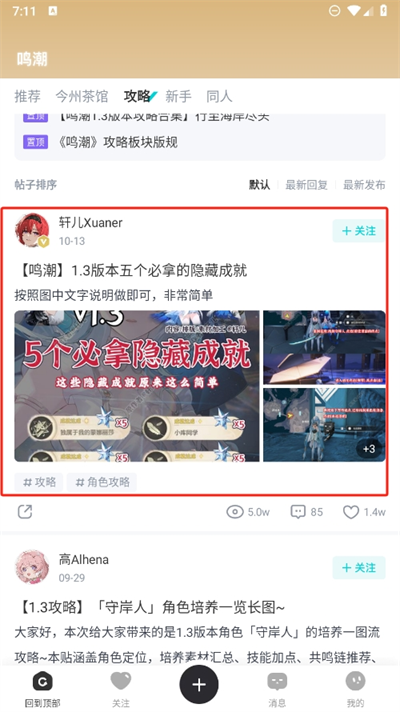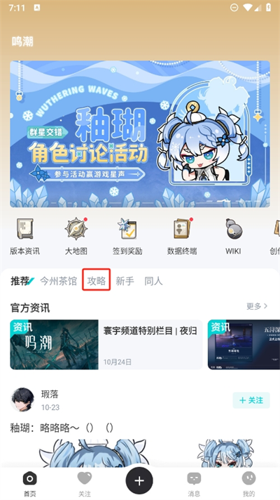 2、比如我們選擇進(jìn)入鳴潮游戲的版塊界面后,在下方可以看到有關(guān)該游戲的攻略版塊信息;