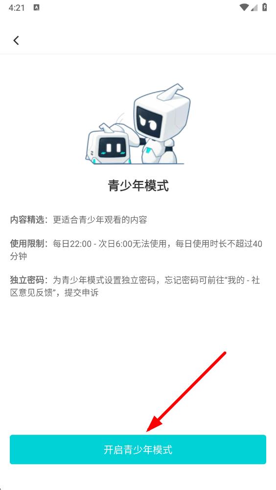 3、在青少年模式頁面,點(diǎn)擊開啟青少年模式按鈕,進(jìn)入密碼設(shè)置界面。