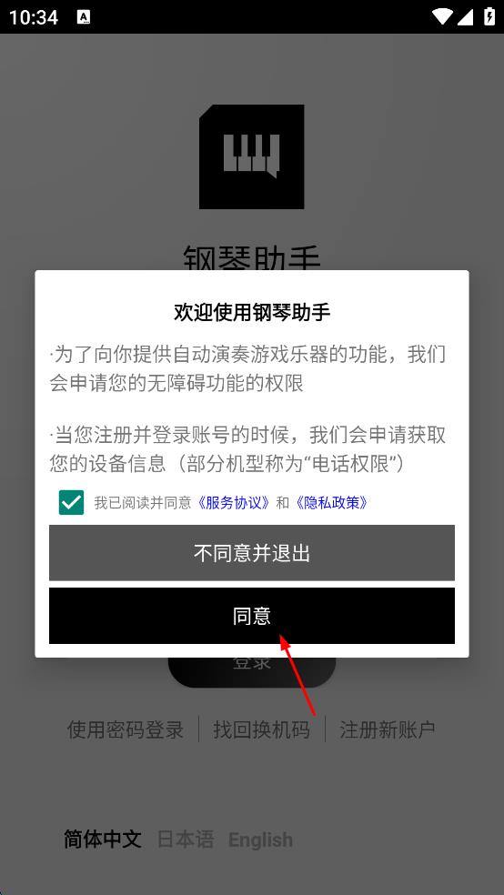 1、打開鋼琴助手,在彈出的歡迎使用提示框中,勾選我已閱讀并同意服務(wù)協(xié)議和隱私政策,然后點(diǎn)擊“同意”。