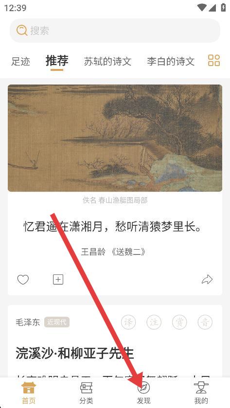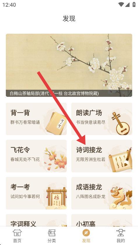 2、在發(fā)現(xiàn)頁面里,找到并點擊詩詞接龍選項。