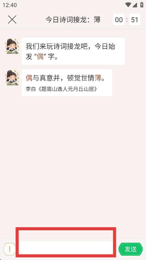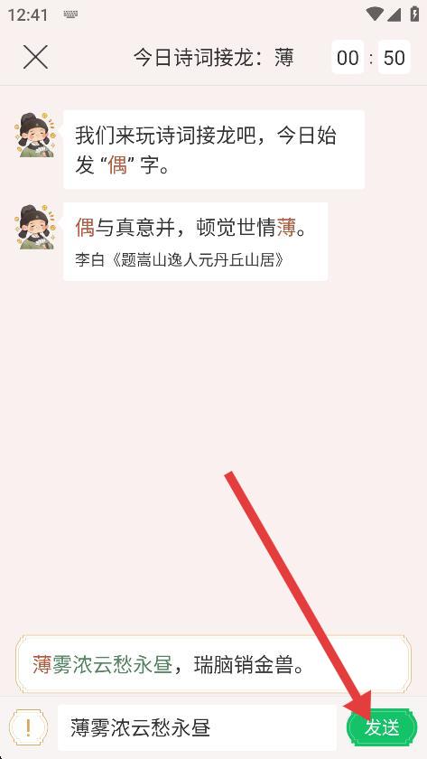 4、輸入完成后,點擊發(fā)送按鈕,提交詩句即可完成詩詞接龍。