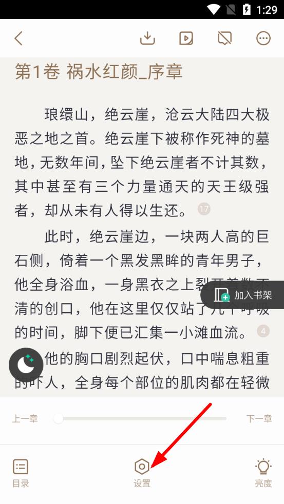 2、在閱讀界面中,點(diǎn)擊底部的設(shè)置按鈕,進(jìn)入閱讀設(shè)置頁面。