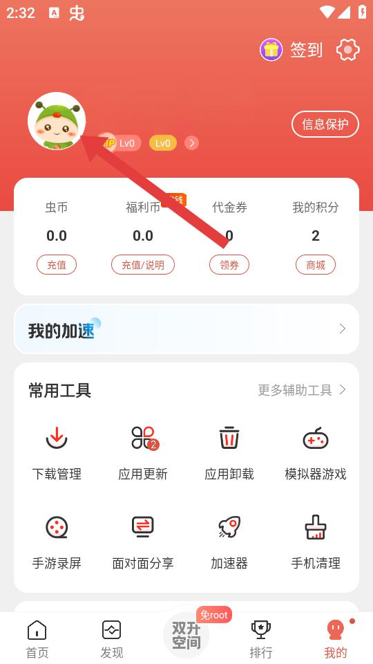 1、打開蟲蟲助手APP,進入我的的頁面,點擊頂部個人頭像的區(qū)域,進入個人信息頁面。