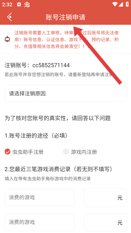 3、在賬號注銷申請頁面,選擇注銷原因,填寫賬號注冊途徑如蟲蟲助手注冊、等信息后提交申請,等待人工審核完成賬號注銷。