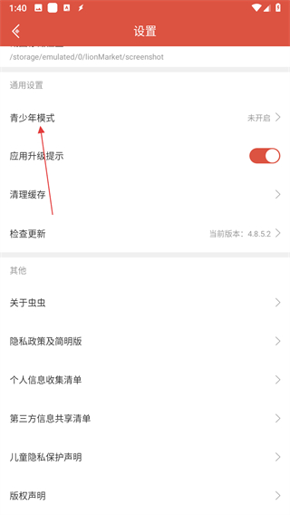 3、在設置頁面找到青少年模式選項,點擊進入青少年模式設置頁面。