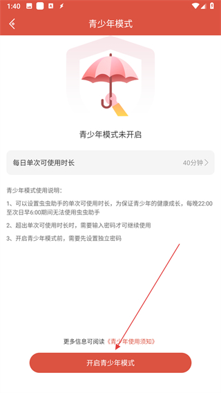 4、在青少年模式設置頁面點擊開啟青少年模式,進入設置密碼頁面。