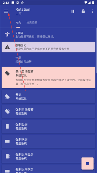 1、打開屏幕方向管理器應(yīng)用,點(diǎn)擊菜單按鈕。