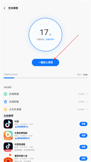 4、進(jìn)入空間清理的頁(yè)面內(nèi),點(diǎn)擊一鍵放心清理的按鈕即可清除。