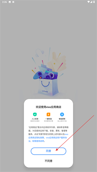 1、打開vivo應(yīng)用商店APP,進(jìn)入時(shí)會(huì)彈出隱私政策,點(diǎn)擊同意的按鈕。