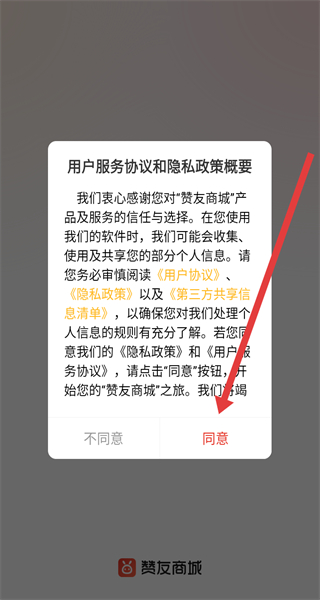 1、點(diǎn)擊“用戶(hù)服務(wù)協(xié)議和隱私政策概要”彈窗的“同意”,進(jìn)入贊友商城首頁(yè)。