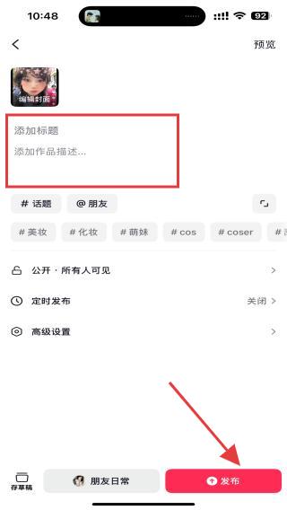 4、進(jìn)入最后的階段,添加標(biāo)題、作品描述后,點(diǎn)擊發(fā)布的按鈕即可完成。