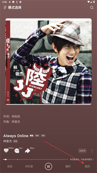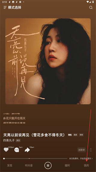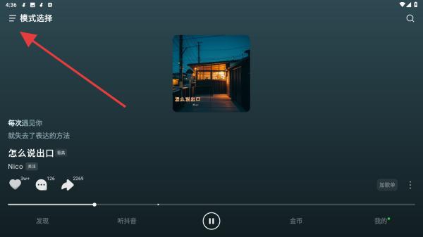 1、打開汽水音樂的歌曲播放界面,點擊左上角的模式選擇。