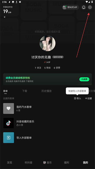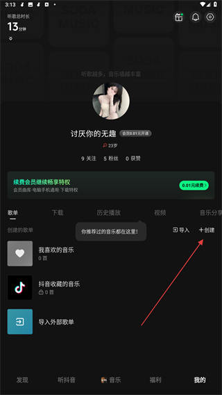 2、進(jìn)入我的頁面內(nèi),在歌單右側(cè)點擊+創(chuàng)建的功能按鈕。