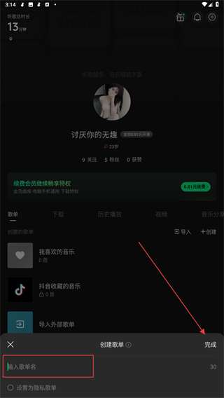3、輸入歌單名稱后,再點擊完成的按鈕即可創(chuàng)建成功。