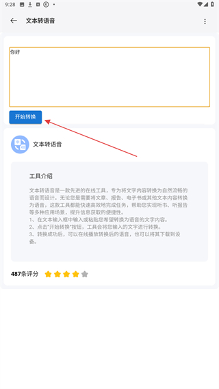 4、進(jìn)入文本轉(zhuǎn)語(yǔ)音的頁(yè)面內(nèi),輸入內(nèi)容后點(diǎn)擊開始轉(zhuǎn)換的按鈕。