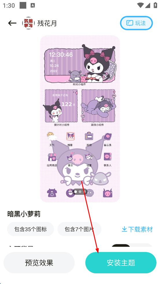 3、在主題詳情頁,點擊“安裝主題”按鈕,等待安裝完成,即可將該主題應用到手機,更換界面樣式。