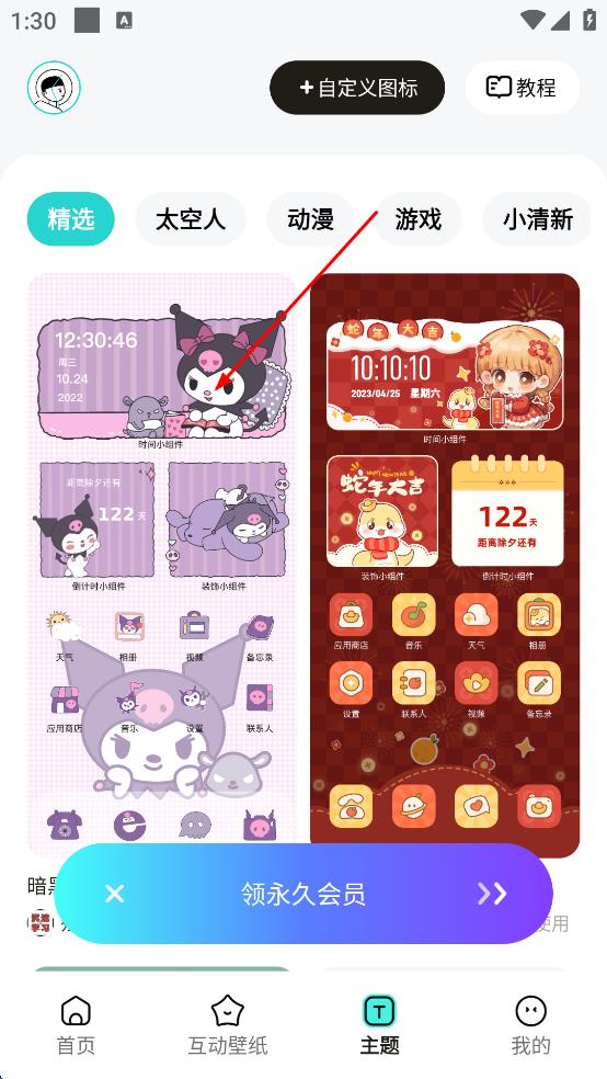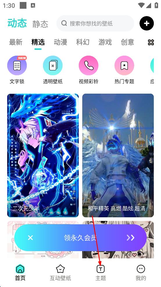 1、打開壁紙軟件,在首頁點擊底部“主題”選項,切換到主題頁面,瀏覽各類主題內(nèi)容,尋找喜歡的風格。