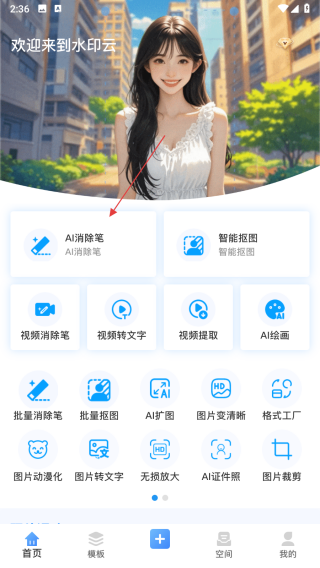 1、打開(kāi)水印云APP,在首頁(yè)點(diǎn)擊AI消除筆功能,進(jìn)入AI消除筆操作頁(yè)面。