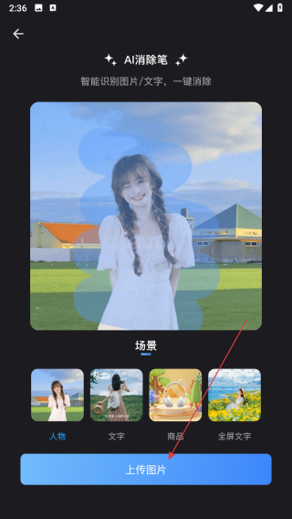 2、在AI消除筆頁(yè)面,點(diǎn)擊上傳圖片按鈕,彈出圖片選擇方式選項(xiàng)。