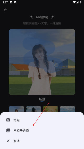 3、在彈出的選項(xiàng)中,選擇從相冊(cè)選擇,從手機(jī)相冊(cè)里選取需要處理的圖片。