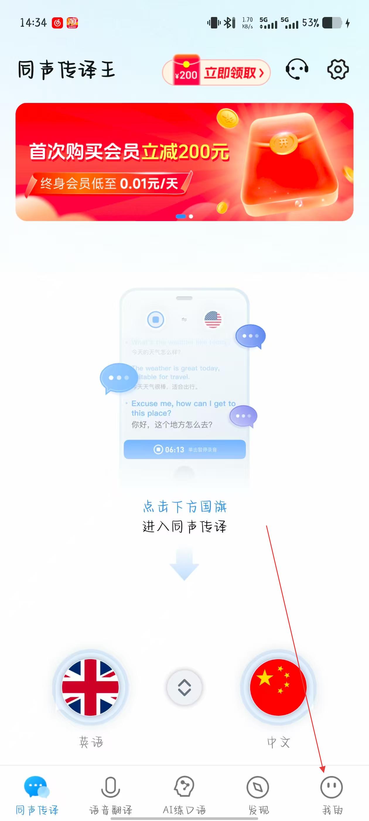 1、打開同聲傳譯王 APP,點(diǎn)擊頁(yè)面右下角我的,進(jìn)入個(gè)人中心頁(yè)面。